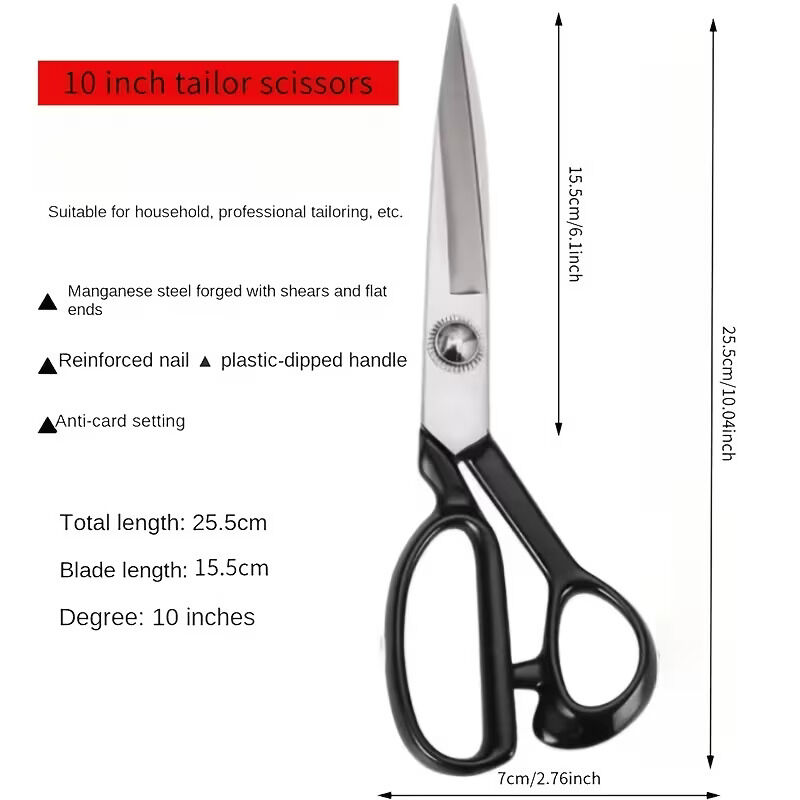 These 10-inch professional tailoring scissors are designed for clean, confident cutting across a wide range of fabrics, from cottons and linens to heavier materials.