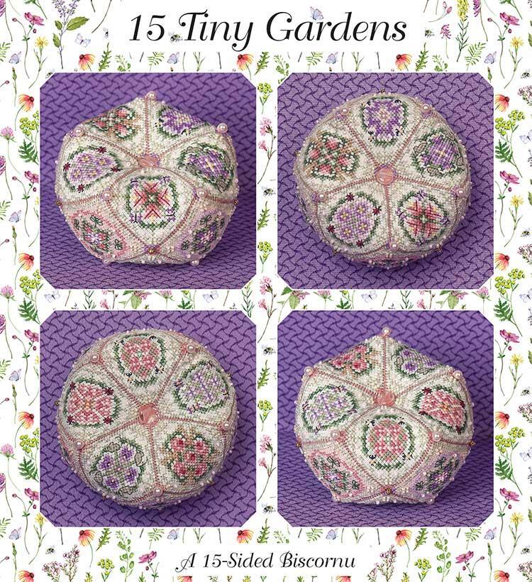 A 15-sided biscornu with little gardens. There is a lot to see, and it is all fun to stitch.