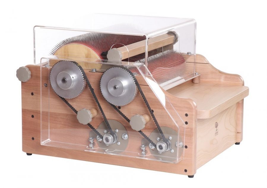 Designed with the most versatile 72 point carding cloth it can handle a wide range of microns from fine combed mill tops to courser locks and texture-adding fibres making it a great all-rounder for those who like to experiment. For very fine fibres you can do a second pass through the carder for beautifully smooth results and for textured art batts you can feed larger chunks of textured fibres straight onto the large drum.