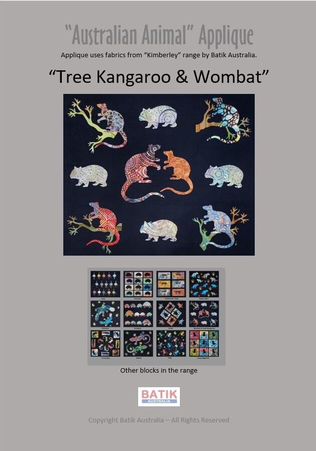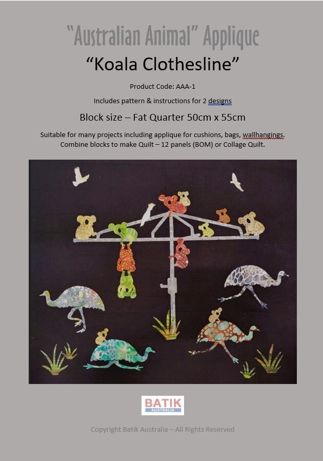 Celebrate Australia’s unique wildlife with the Australian Animal Applique Patterns – Koala Clothesline & Tree Kangaroo/Wombat. These applique designs use the vibrant “Kimberley” batik fabrics by Batik Australia to create playful and eye-catching blocks.