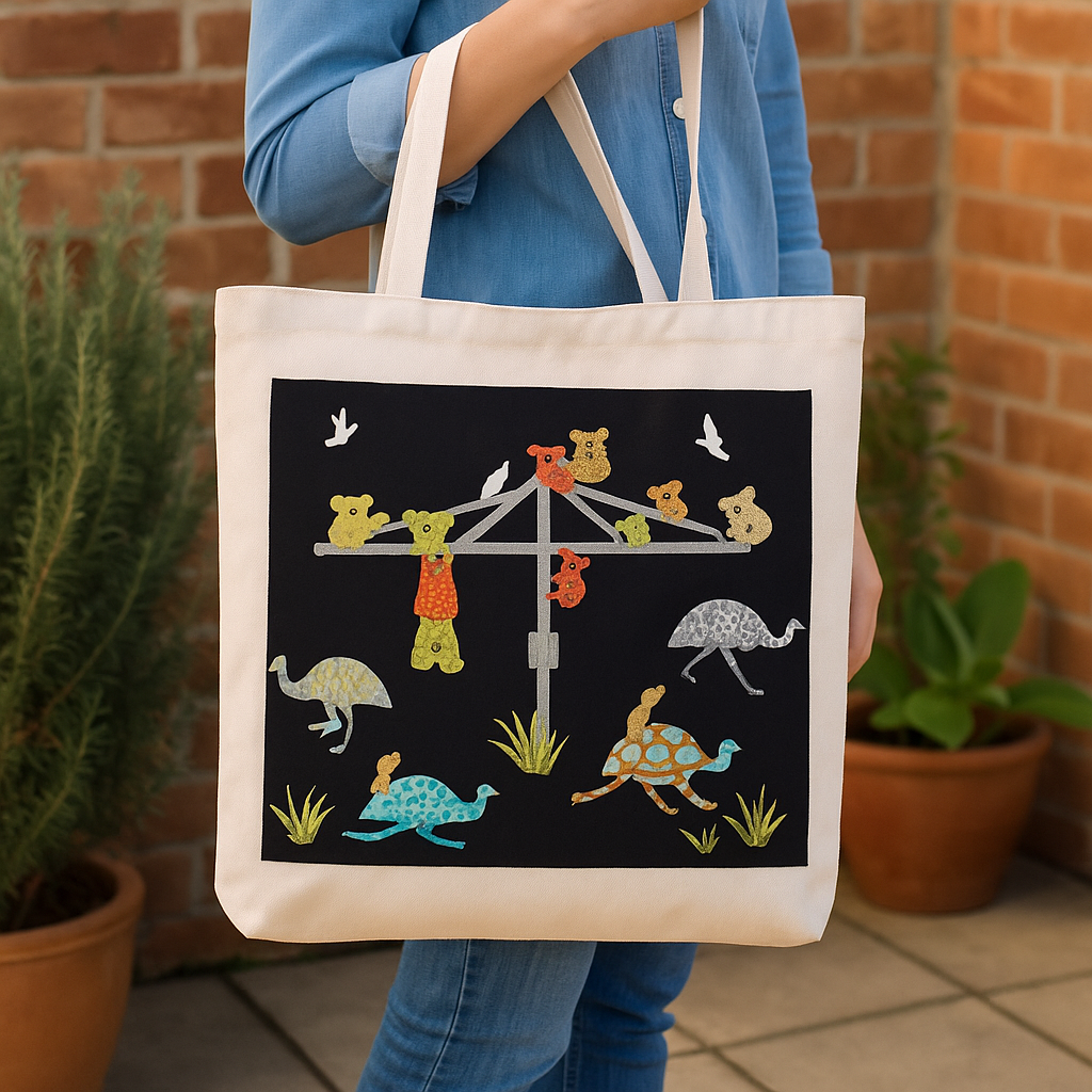 The Koala Clothesline pattern features cheeky koalas hanging from a Hills Hoist, with emus and other playful touches, perfect for adding whimsy to cushions, wall hangings, or quilts. The Tree Kangaroo & Wombat pattern showcases two much-loved native animals in intricate applique detail, ideal for feature blocks or combined with the full Australian Animal range.