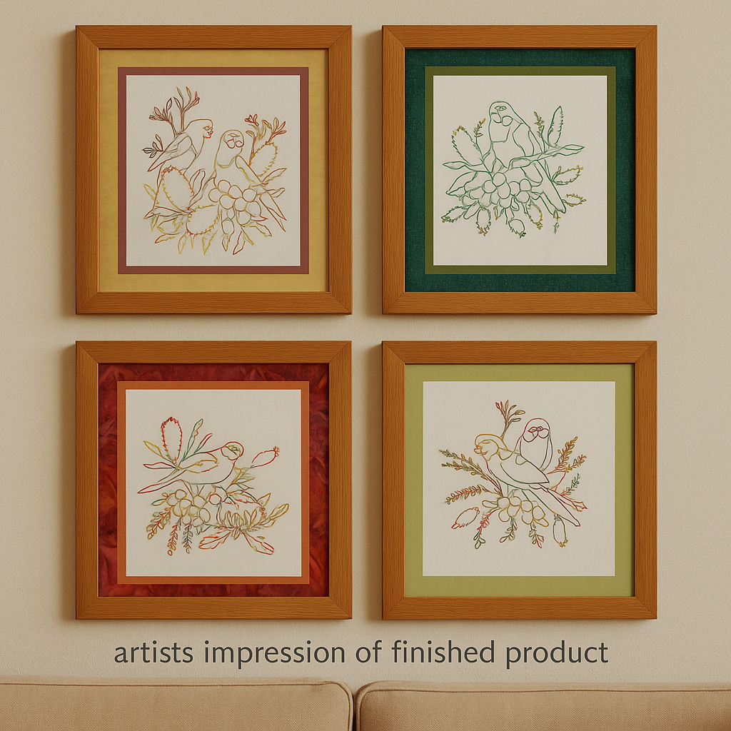 Design #1 — DMC Coloris 4509: Two cheeky rosellas sharing a branch and a quiet moment. Gentle lines and an easy, soothing stitch.