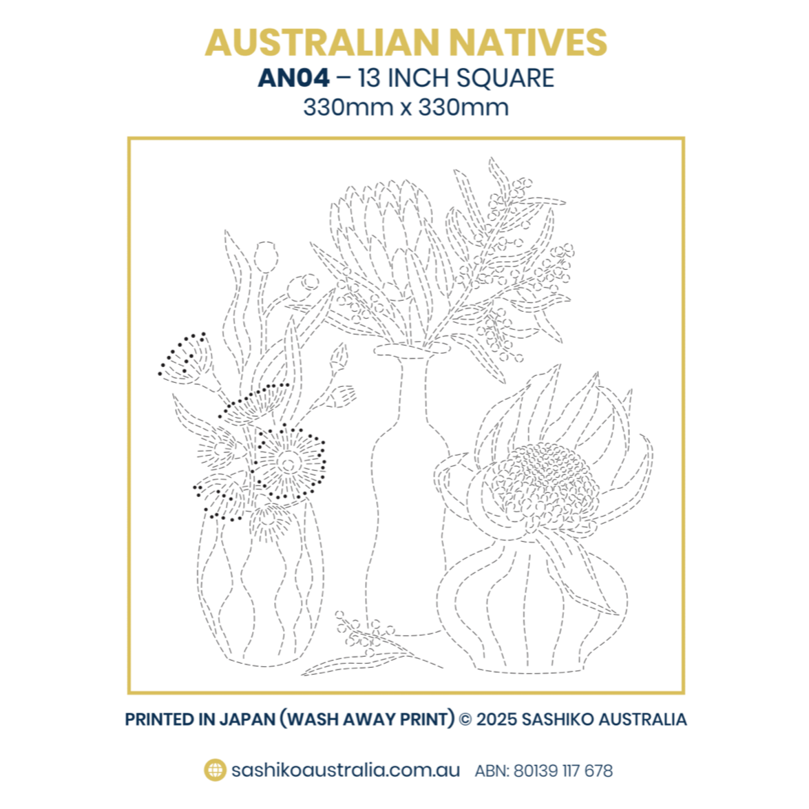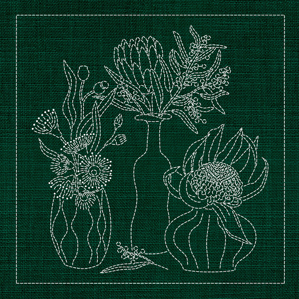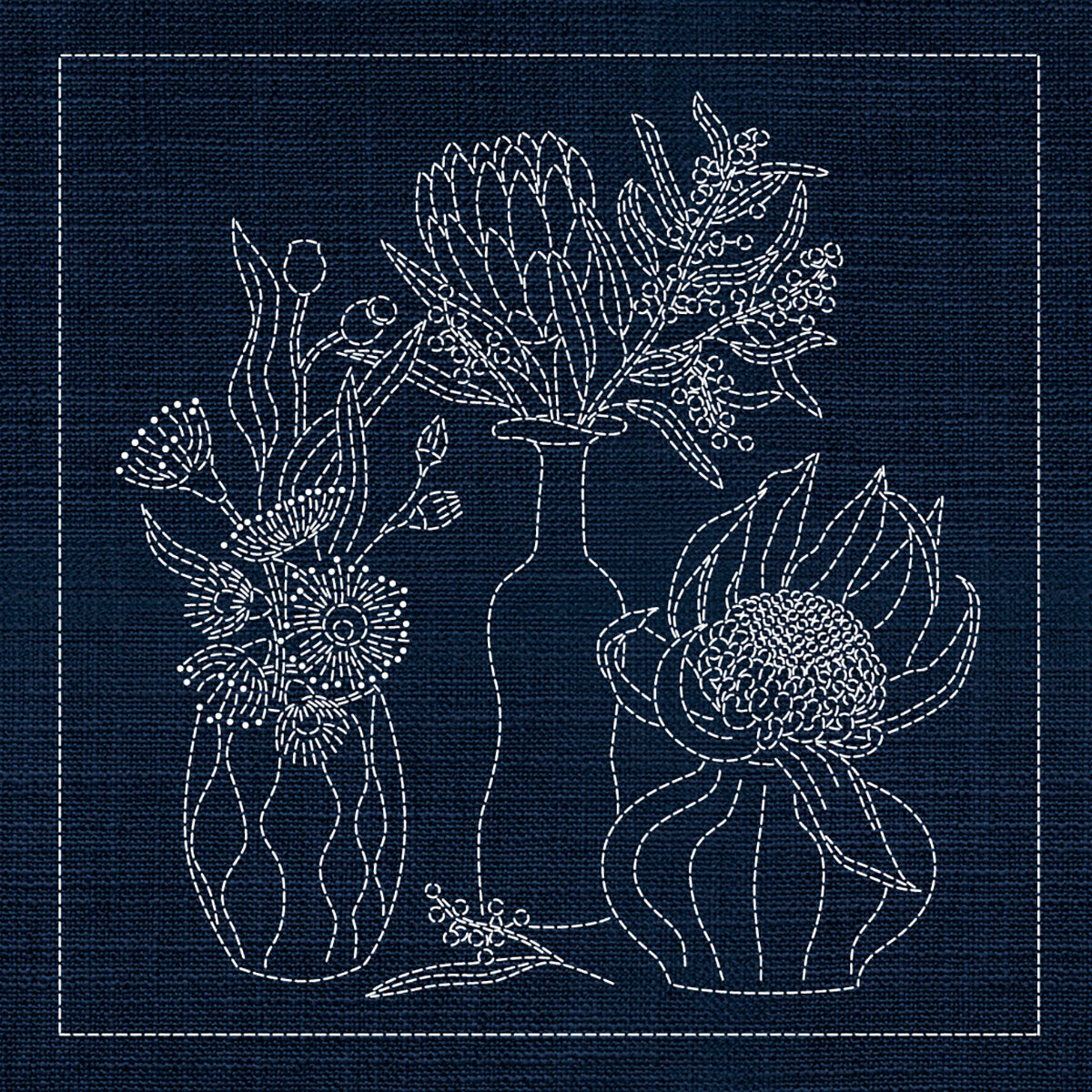 The Australian Native Floral Collection is inspired by the distinctive forms and textures of Australian native flowers, translated into flowing sashiko stitch lines.