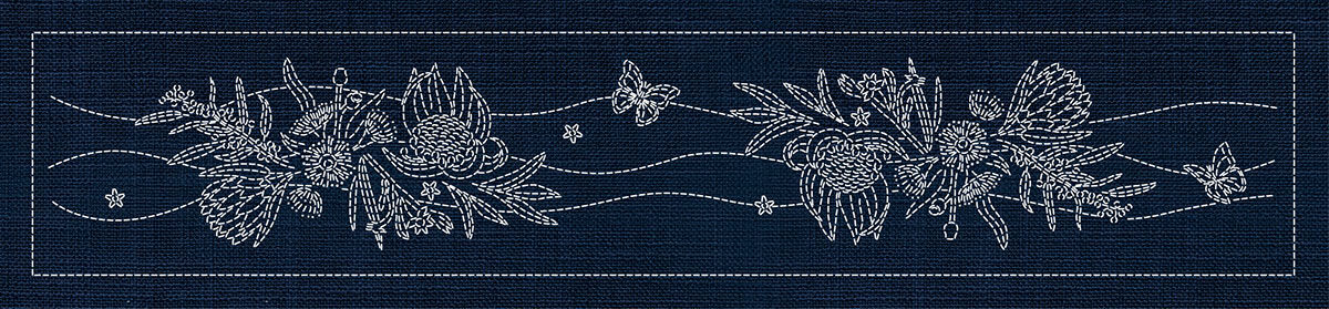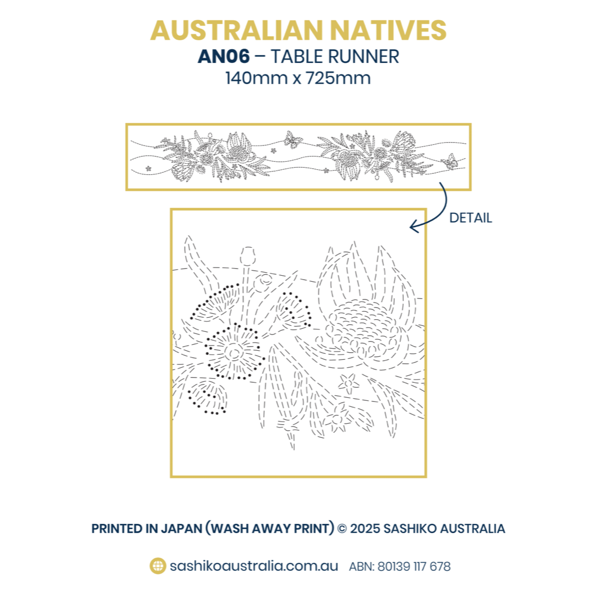 The AN06 design from the Australian Native Floral Collection showcases Australian native flowers arranged in a softer, more organic sashiko flow, creating visual movement along the length of the runner.