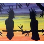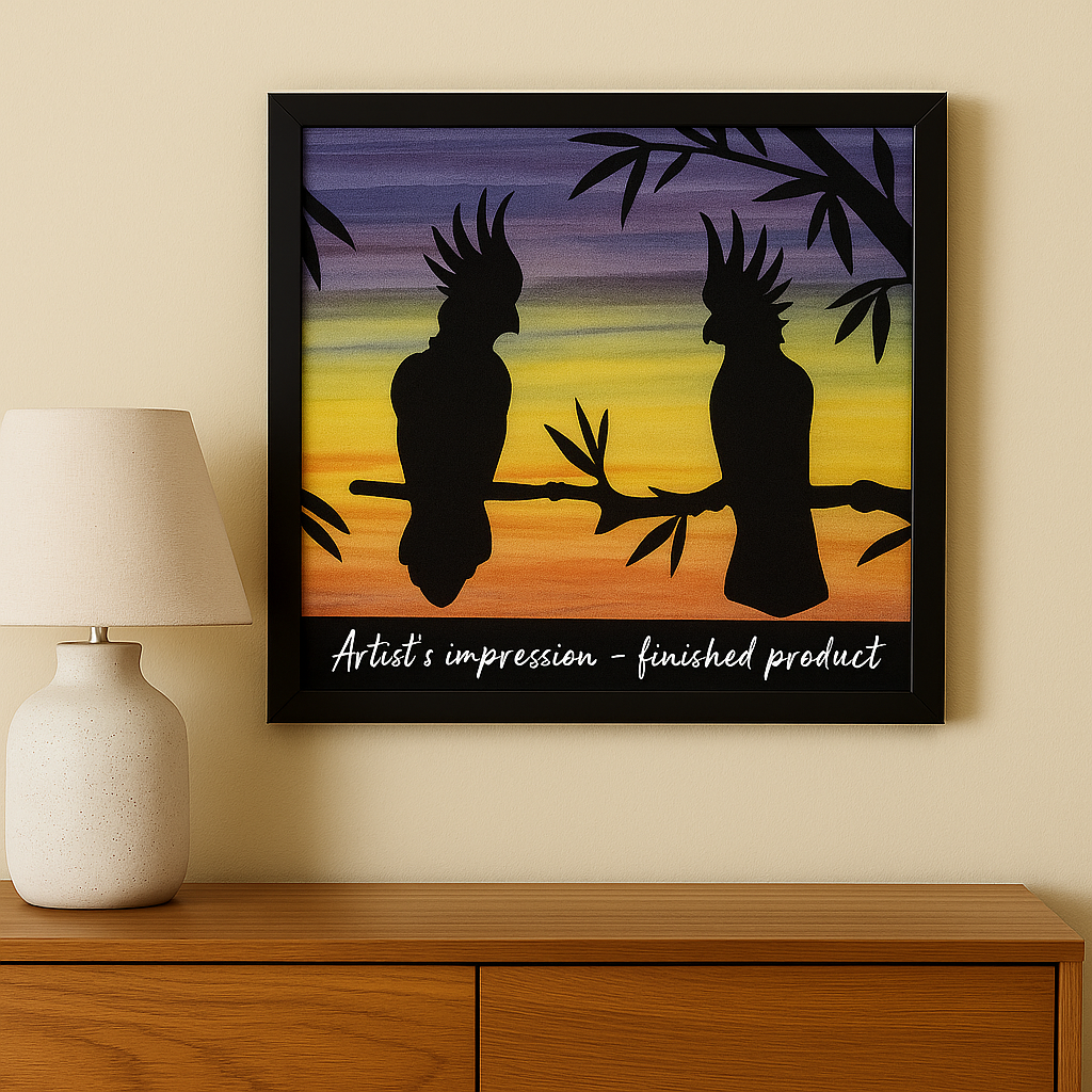Capture the beauty of Australia’s birdlife with the Batik Australia – Cockatoo Silhouette Panel Kit. This raw-edge appliqué kit features two cockatoos perched among branches, silhouetted against a colourful batik sunset sky of purples, yellows, and oranges.