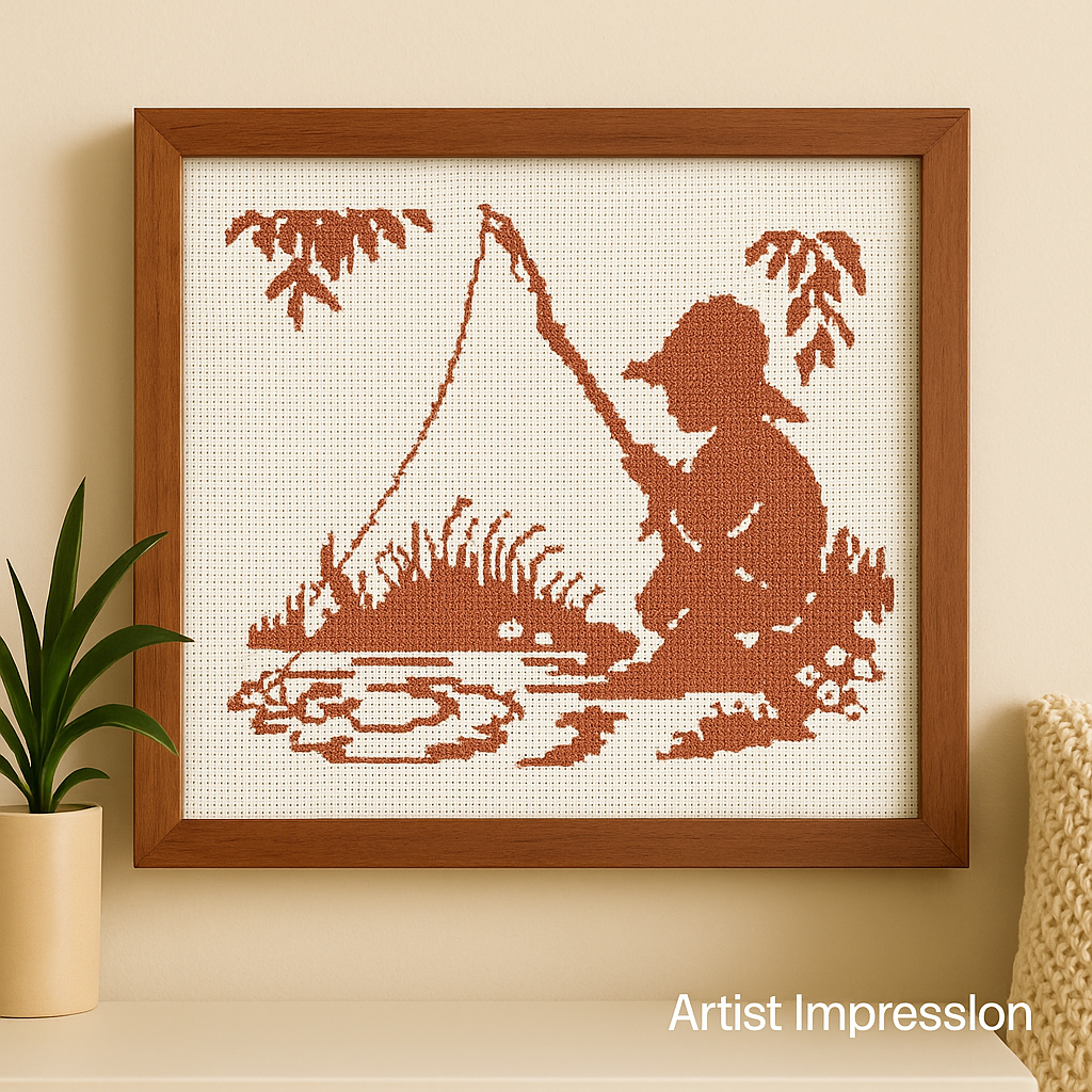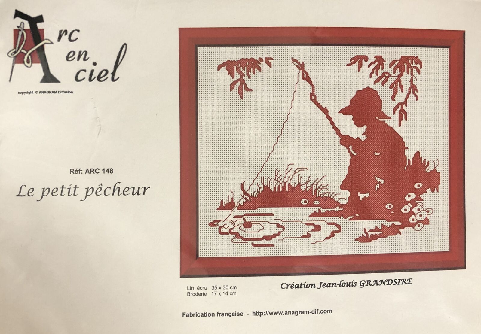 Le petit pêcheur by Jean-Louis Grandsire is a classic French monochrome cross stitch design that captures the peaceful charm of a young boy fishing by the water’s edge.