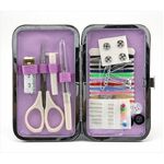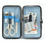 Kit includes tape measure, scissors, hand needles, seam ripper, thread, buttons, snaps, safety pins, pearl head pins