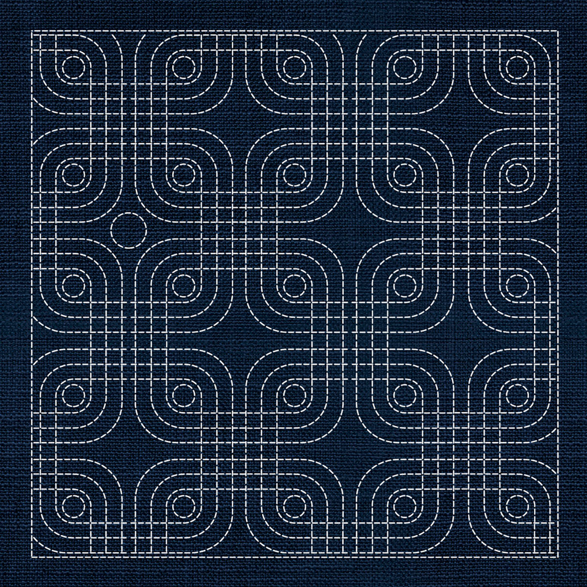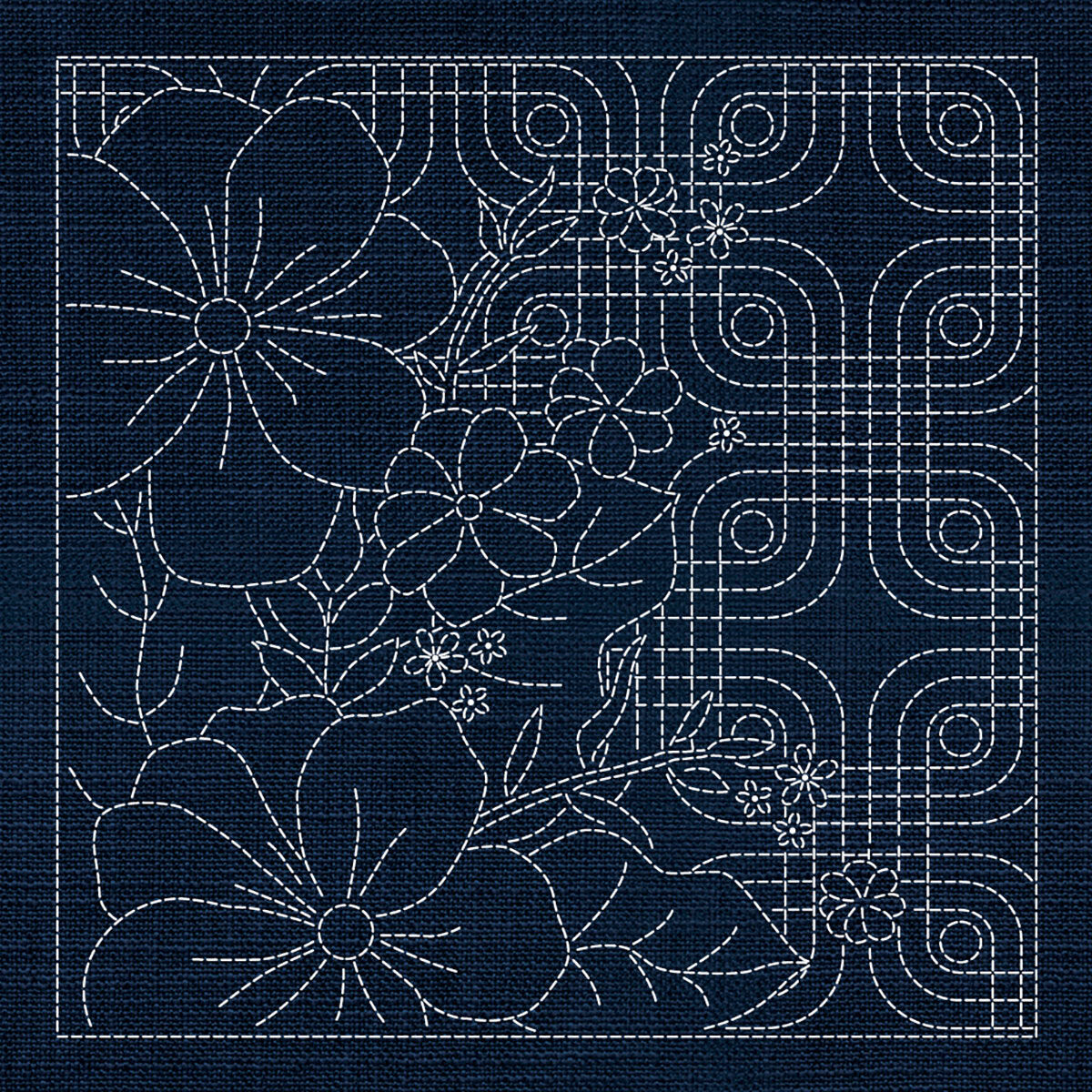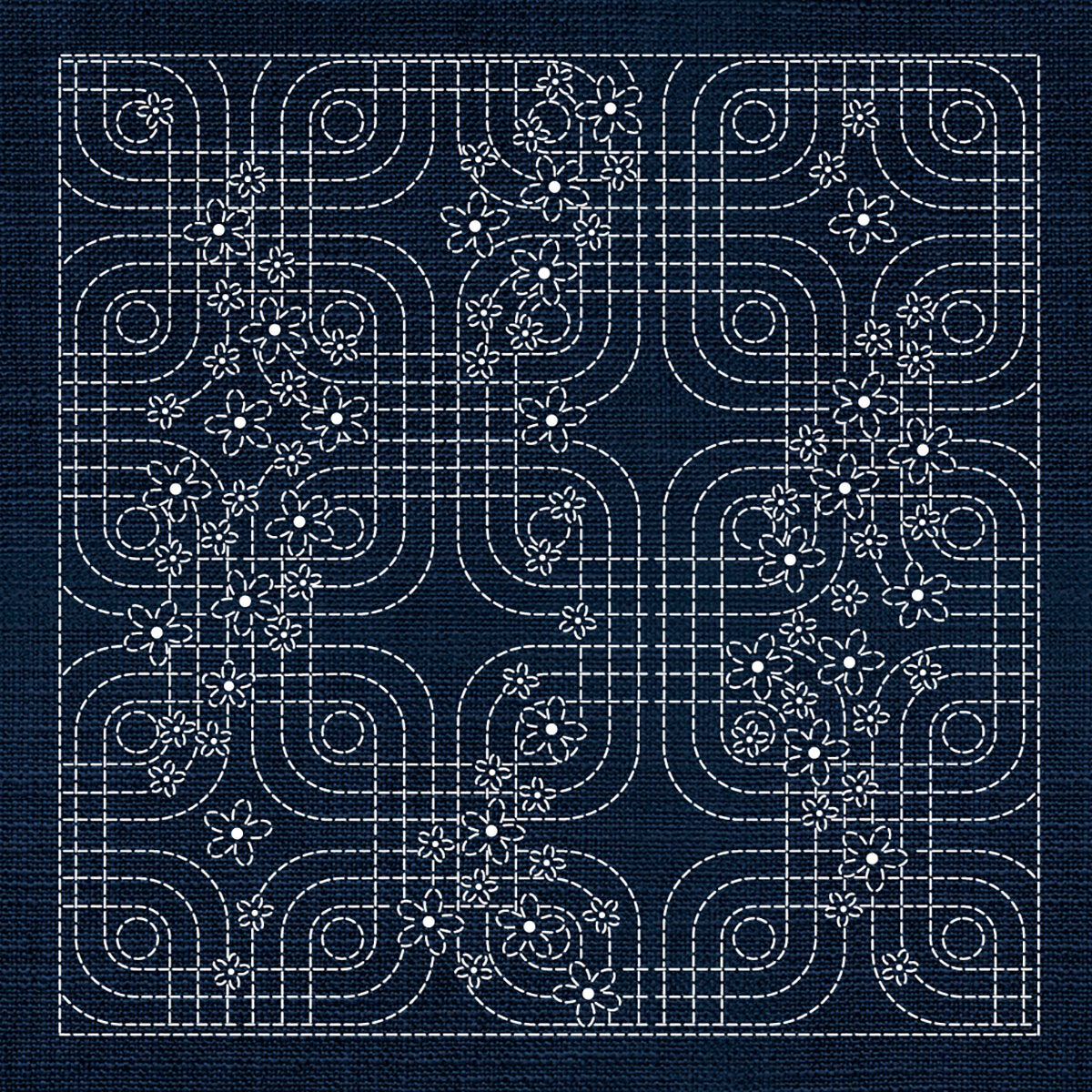Discover the elegance of traditional Japanese-inspired pattern and floral design with this striking Sashiko master panel featuring six pre-printed embroidery designs on one generous 100cm x 100cm indigo panel.