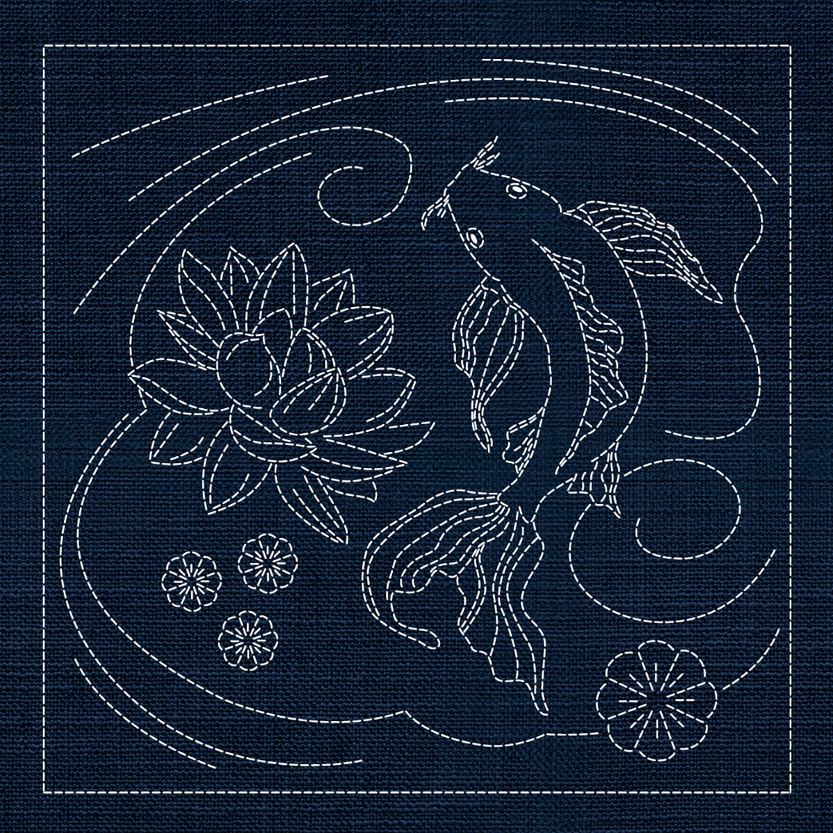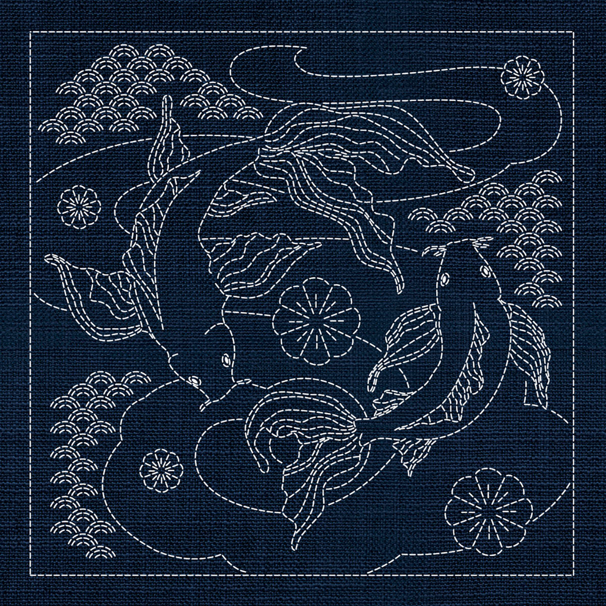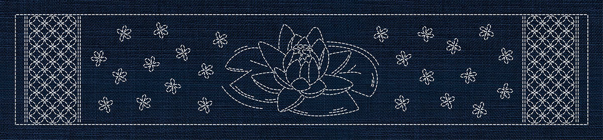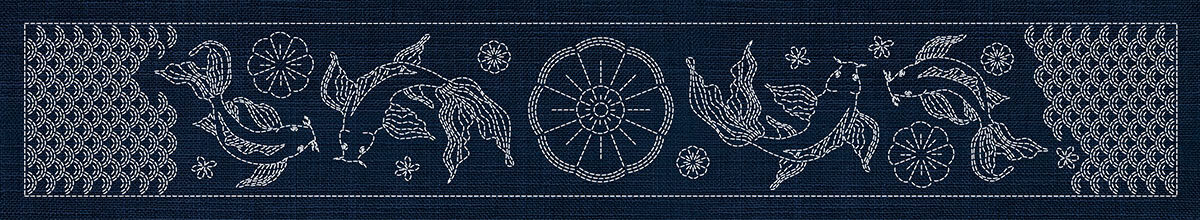 A remarkable sashiko master panel featuring all six designs from the Japanese Collection arranged in one large-format pre-printed panel on traditional Indigo fabric.