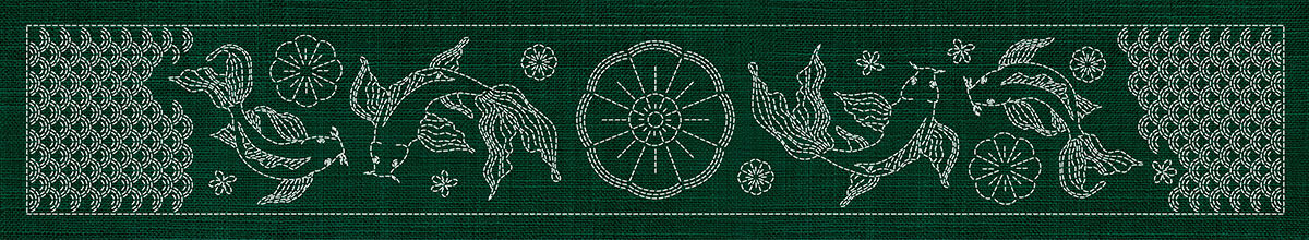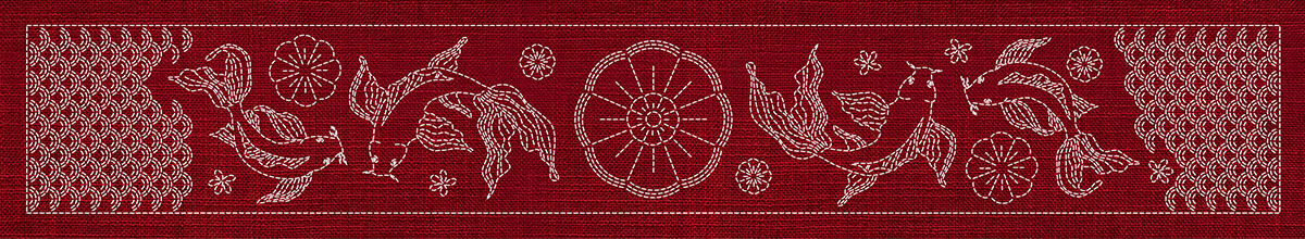 JP05 Butterfly Koi and Blossom Runner is a sashiko table runner panel featuring butterfly koi with plum blossoms (mume) in a long, elegant layout.
