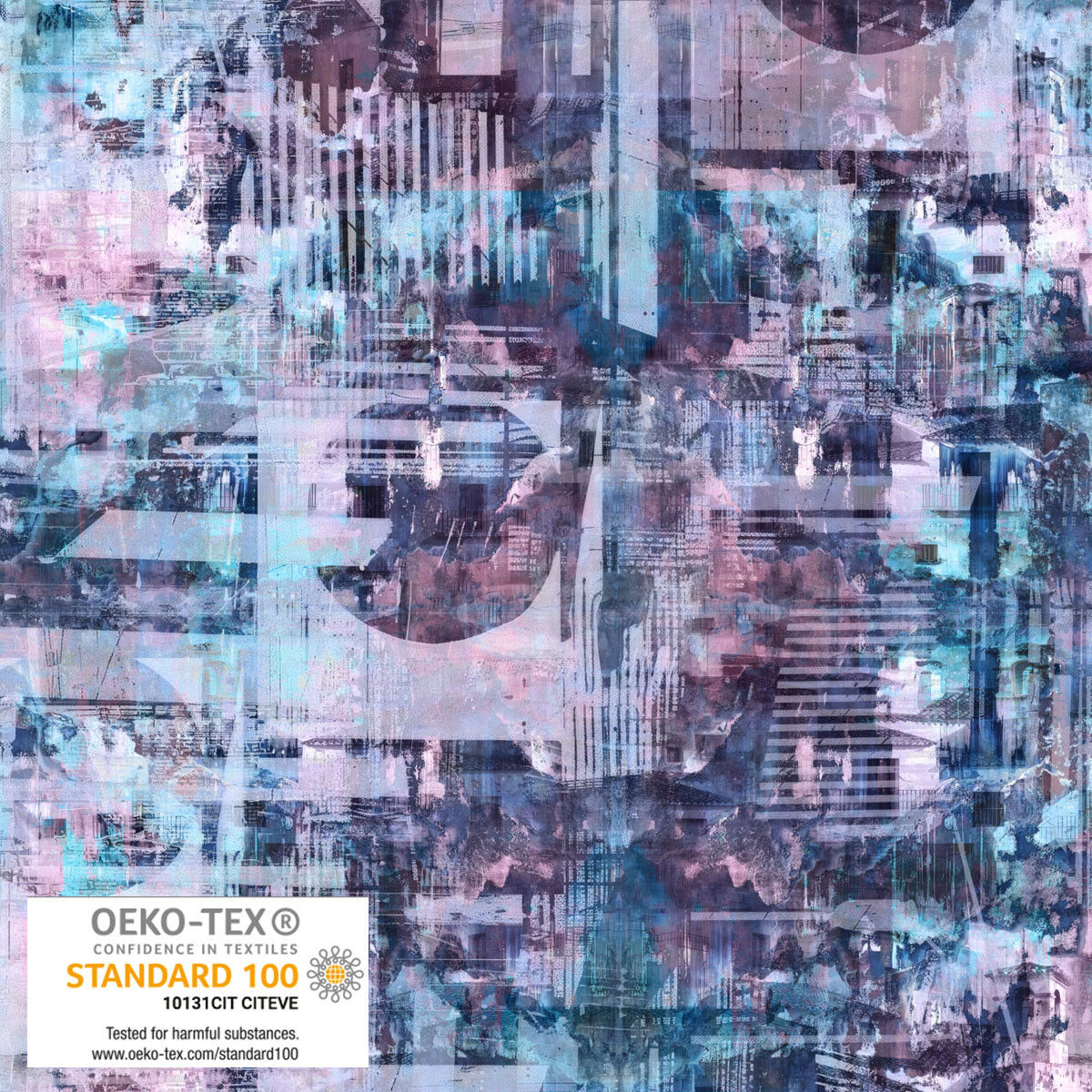 This striking modern print layers abstract architectural forms, textures and graphic elements into a rich urban collage, creating depth, movement and visual interest across the fabric surface.