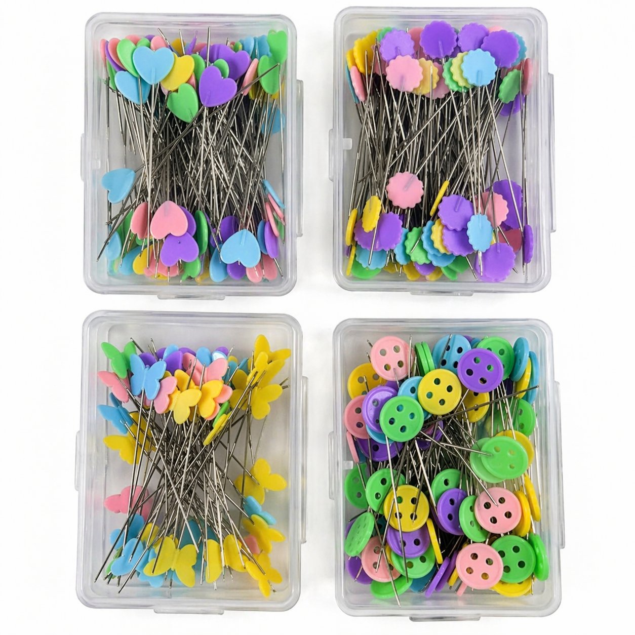 Add colour and charm to your sewing kit with these Tub Marking Pins (50 pcs) — a set of fine steel pins topped with pastel shapes including hearts, buttons, flowers, and butterflies.