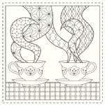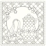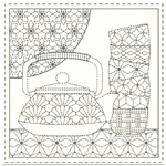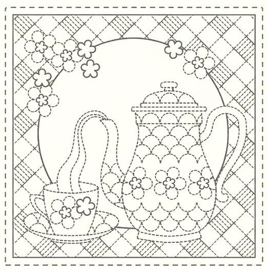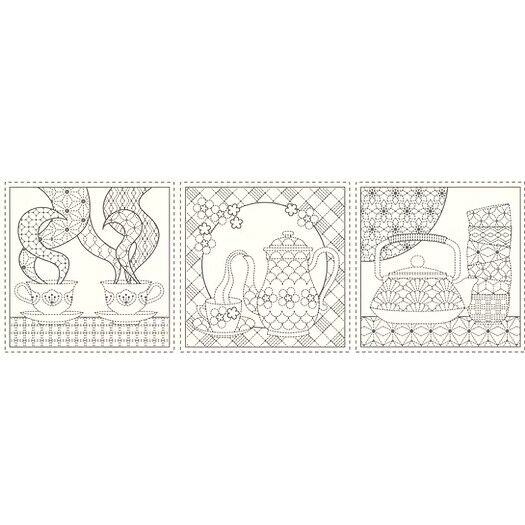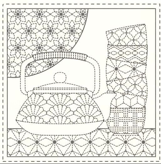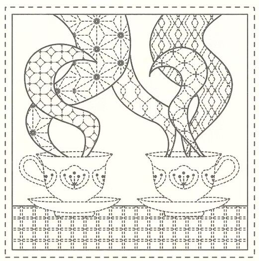 A charming Sashiko panel celebrating the simple pleasure of teatime, featuring delicate teacup and teapot motifs arranged across a natural linen blend.