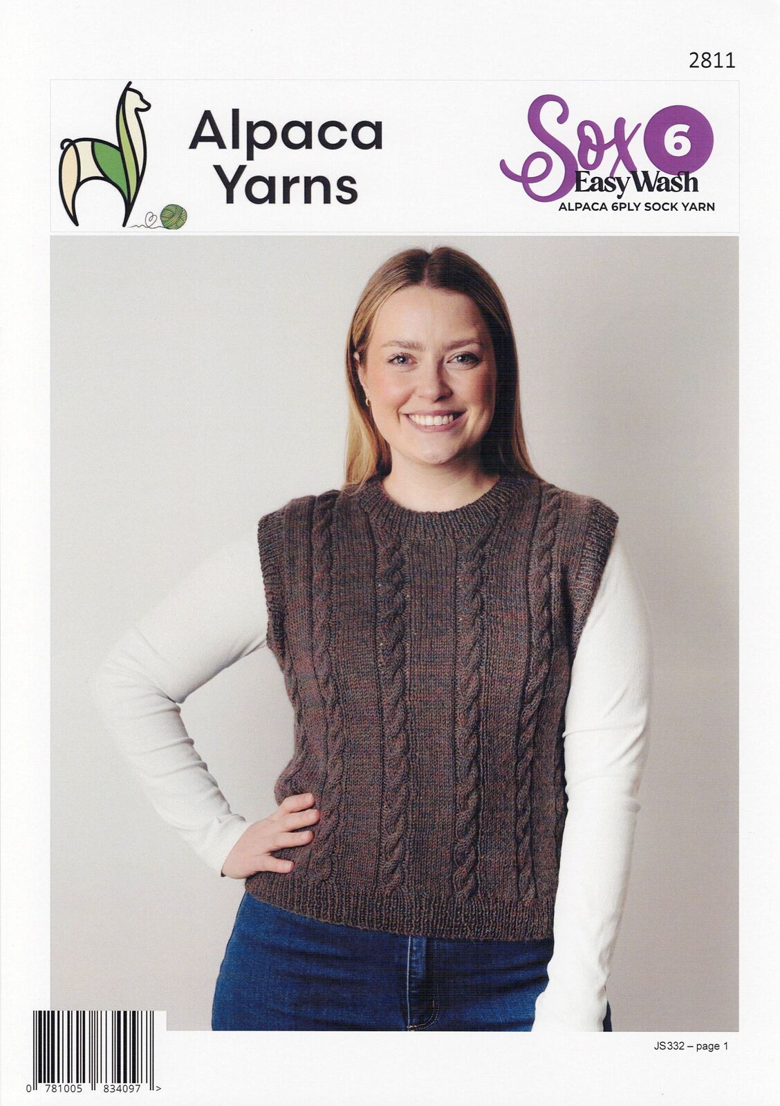 Use Alpaca Yarns Easy Wash Sox 6 Ply, 150gm yarn to knit this Cable Vest in a range of sizes from Small to Large.