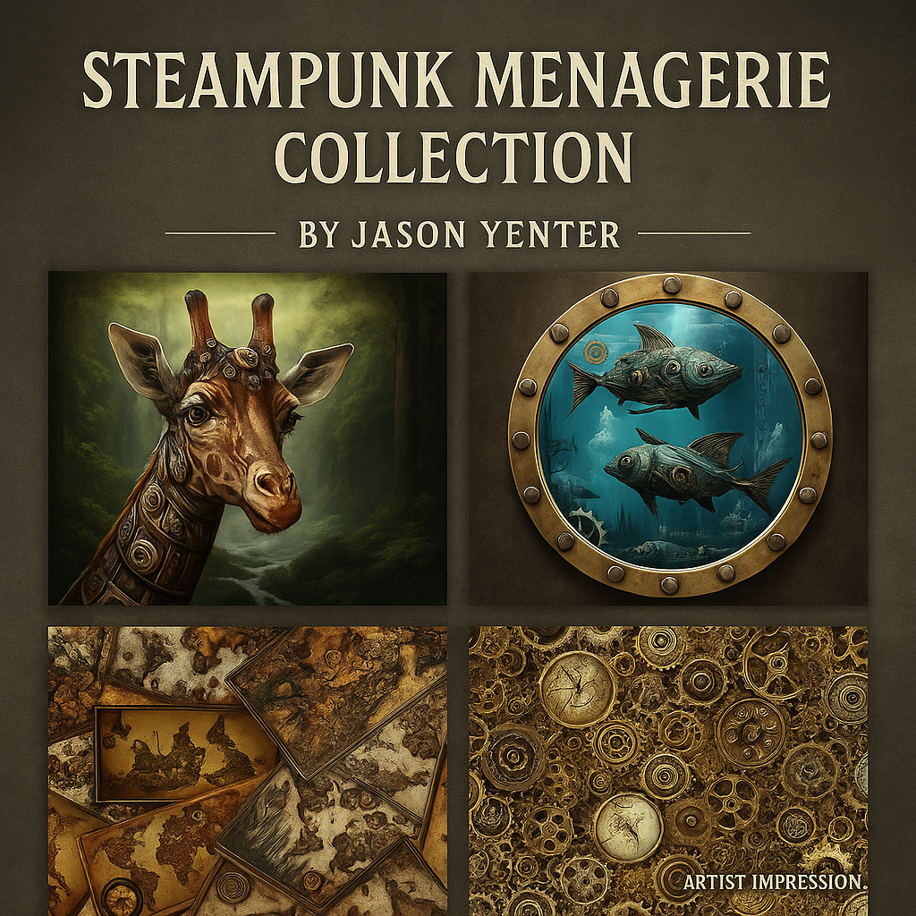 The *Steampunk Menagerie Collection* by Jason Yenter blends Victorian machinery with lush fantasy worlds, creating a striking fusion of metalwork, nature, and imaginative engineering.