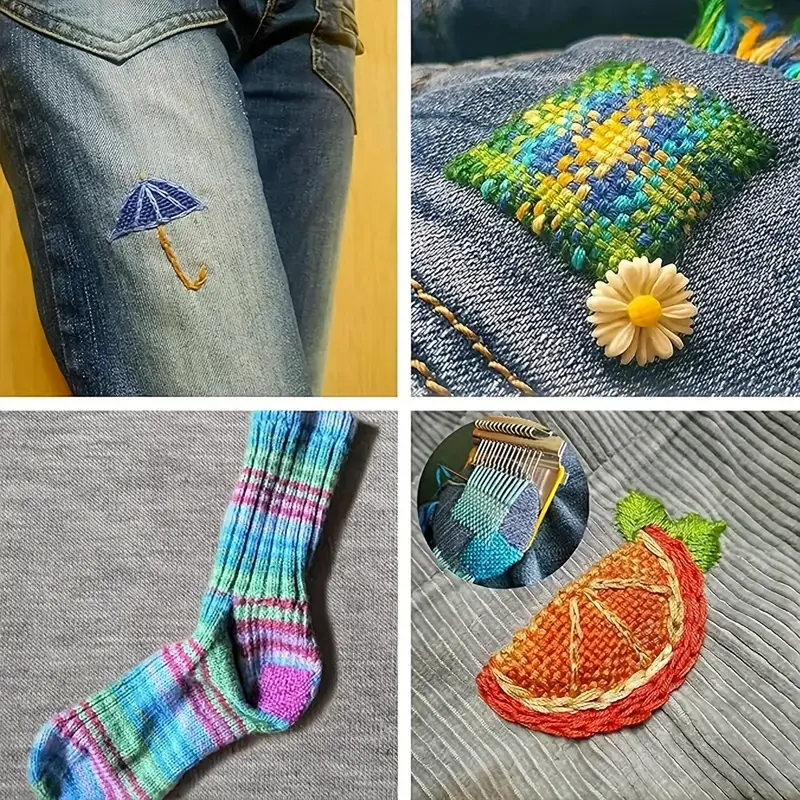 This compact hand-weaving loom set is designed for repairing small holes, reinforcing worn areas and adding decorative patches to garments.