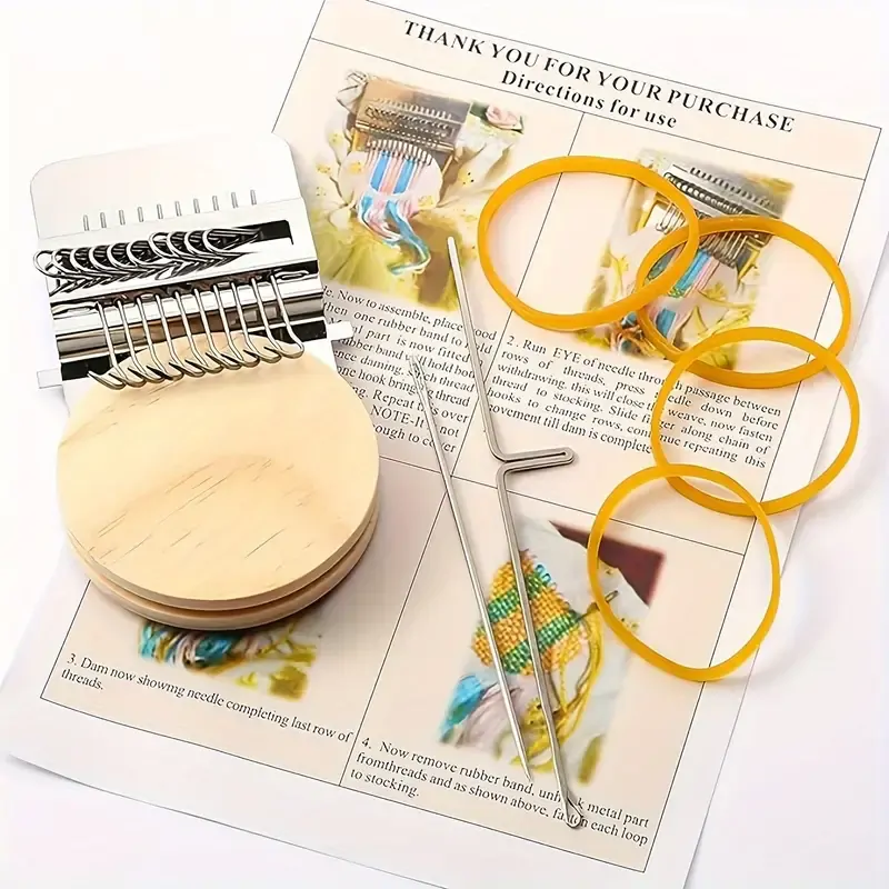 Each set includes the loom plate, matching round wooden base, a steel needle, loom pick tool and rubber bands to secure the fabric.
