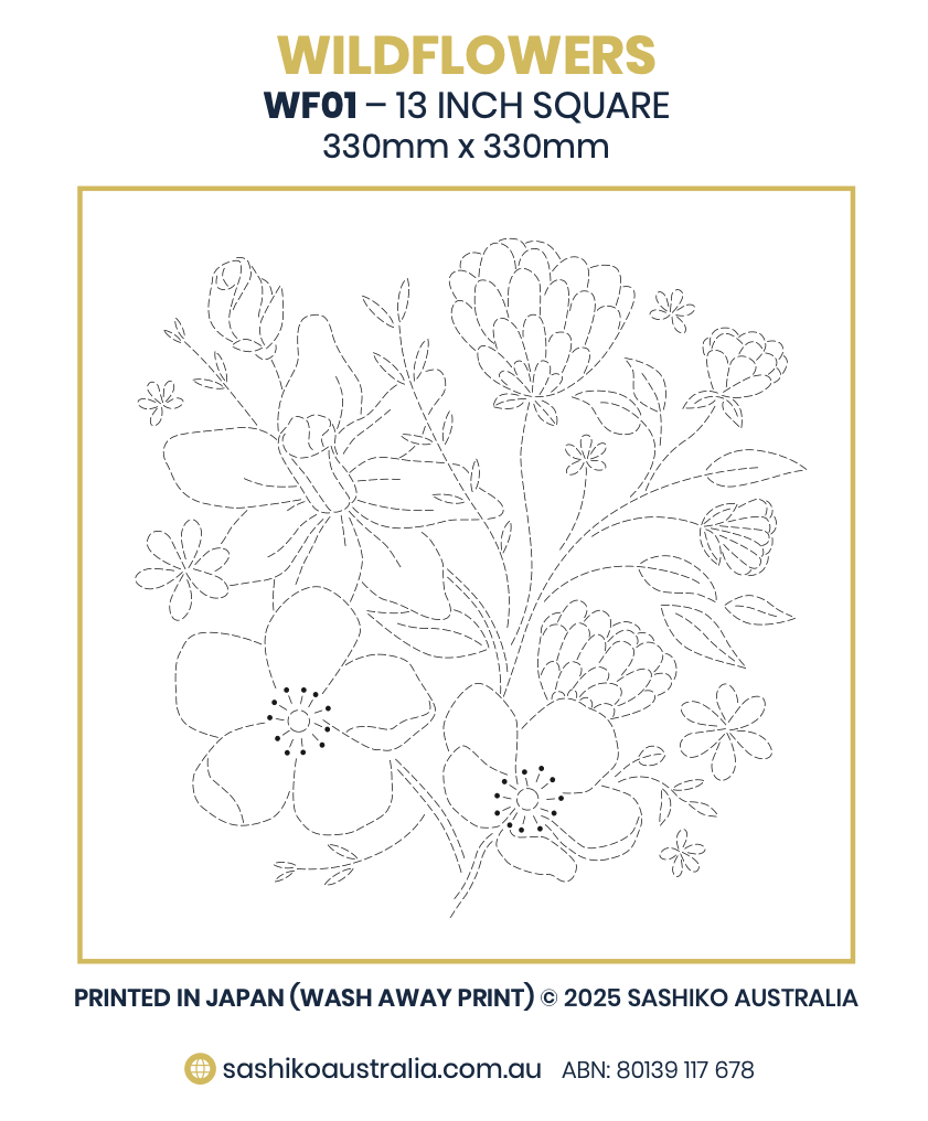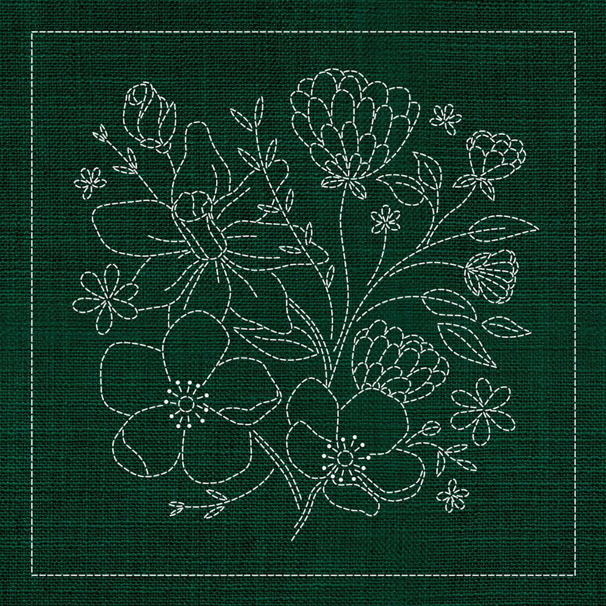 The Wildflower Bouquet Sashiko Panel features a graceful floral arrangement inspired by native and meadow wildflowers, combining flowing stems, layered blooms, and delicate stitch pathways.