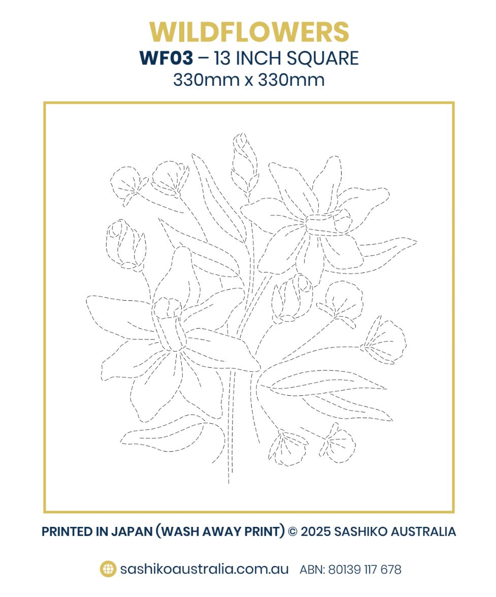 WF03 – Daffodil features an elegant cluster of daffodil blooms rendered in flowing, balanced sashiko stitch paths. The design combines open petals, gentle curves, and bud details that suit both beginners and more confident stitchers.