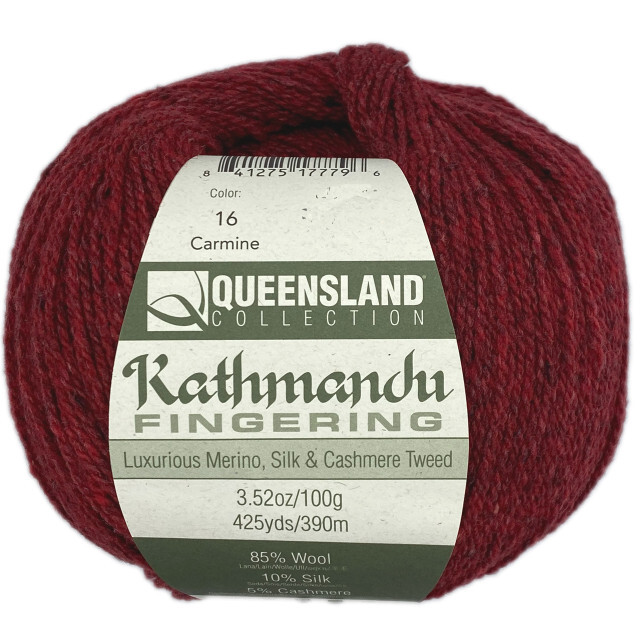 Kathmandu Fingering is a fingering/4 Ply weight addition to Queensland's popular Kathmandu family of yarns. It is a luxurious Merino, Silk and Cashmere tweed that comes in big 100 gram skeins with 425 yards of sumptuous yarn. Kathmandu Fingering knits and crochets to make gorgeous heirloom quality garments and accessories and can also be used for weaving.